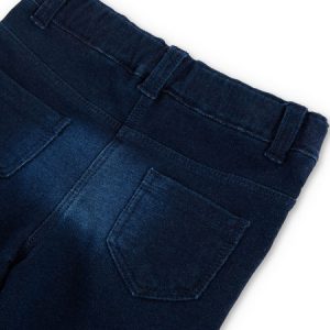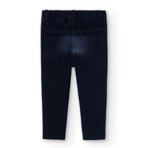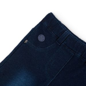 Pantalón de felpa elástica tejanera de niña en color azul oscuro, se ajusta con goma, los bolsillos delanteros y bragueta son de adorno. La decoración es una etiqueta con detalle de la marca. Esta prenda lleva unos desgastados que le dan un aspecto más envejecido.