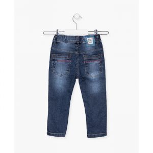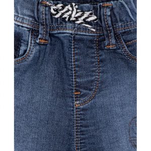 Pantalon vaquero de felpa interior con estampado de dinosaurios en la parte zona del muslo izquierdo. Cintura ajustable con cordon y goma con boton interior. Bolsillos delanteros y traseros.