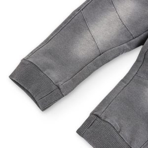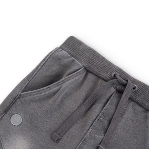 Pantalón de felpa elástica tejanera de niño en color gris, se ajusta con goma y cordón. La decoración es una etiqueta con detalle de la marca. Esta prenda lleva unos desgastados que le dan un aspecto más envejecido. Disponible de la talla 6 meses a 6 años.