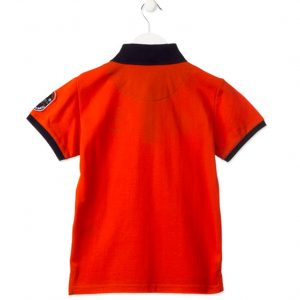 Polo de manga corta en piqué de color naranja para chico. Polo de manga corta en tejido piqué de color naranja. Con tejido canalé en color azul en mangas y cuello. Botones, media lunainterior y tapeta interior de color azul. Con parches y bordados en el pecho y manga. Con abertura en los laterales del bajo.