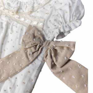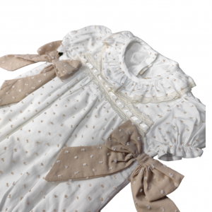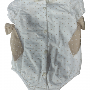 Prepara a tu pequeña para aventuras llenas de estilo y comodidad con esta encantadora ranita en color blanco con puntitos marrones. Confeccionada con los materiales más suaves y diseñada pensando en la delicada piel de los recién nacidos, esta ranita es perfecta para mantenerla fresca y cómoda durante todo el día.