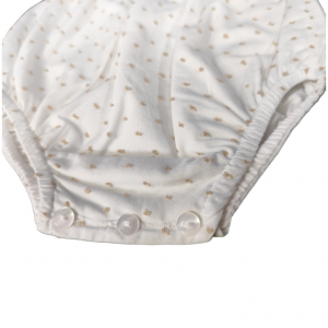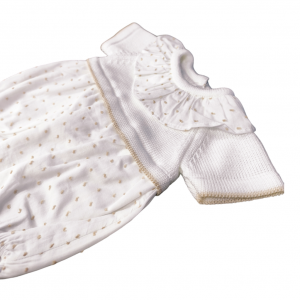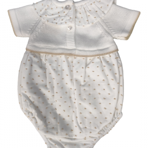 Prepara a tu pequeña para aventuras llenas de estilo y comodidad con esta encantadora ranita en color blanco con puntitos marrones. Confeccionada con los materiales más suaves y diseñada pensando en la delicada piel de los recién nacidos, esta ranita es perfecta para mantenerla fresca y cómoda durante todo el día.