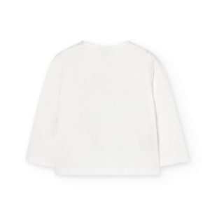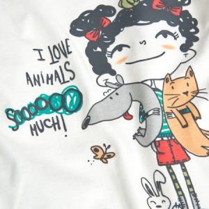 Camiseta de niña en punto liso en color blanco roto, con cierres a presión en hombro izquierdo. Lleva como decoración el dibujo de una niña con animales y una frase.