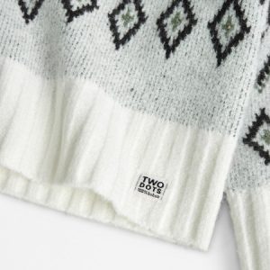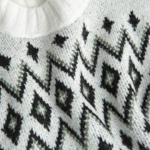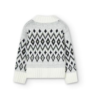 Jersey de manga larga de tricotosa en color blanco químico para niña. El jersey es de cuello alto, con canalé en cuello, puños y bajo, y tiene un jacquard de rombos negros.