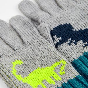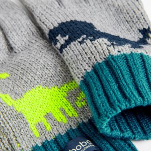Guantes de tricotosa unisex con dibujo jacquard de dinosaurios. La decoración es una etiqueta con detalle de la marca.