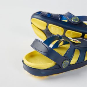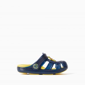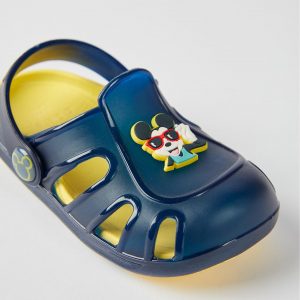 Sandalias azul oscuro y amarillas tipo clogs para bebé niño, flexibles y muy confortables. Aplicación de Mickey de goma en la parte superior. Tira desmontable para usar como zueco o sandalia. Suela antideslizante. Línea de calzado ‘ZY Delicious’, con detalles perfumados.