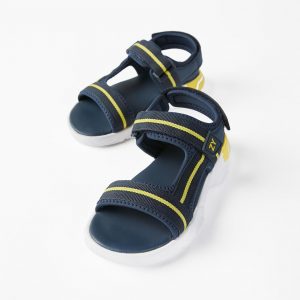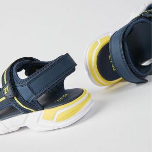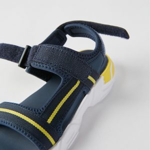 Sandalias azul oscuro para niño, con raya amarilla a contraste. Parte superior con tiras de tejido. Cierre con tiras autoadherentes en la parte superior y detrás, para calzar y ajustar con facilidad. Suela muy ligera y antideslizante.