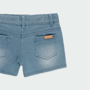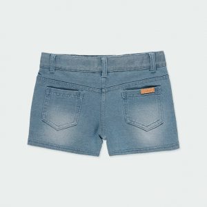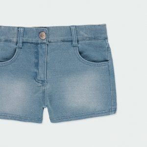 Short de felpa tejanera elástica de niña en color bleach, se abrocha con botón, la cintura se ajusta con goma de ojales y botón interior. La decoración es una etiqueta con detalle de la marca. Esta prenda lleva unos desgastados que le dan un aspecto más envejecido.