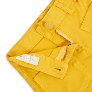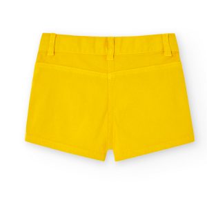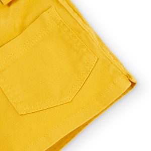 Short de sarga elástica para niña en color amarillo. Con detalle de abertura en el lateral del bajo. Patrón de dos bolsillos de plastrón en el delantero con etiqueta y botón a tono. La cintura es ajustable con goma interior y botón.