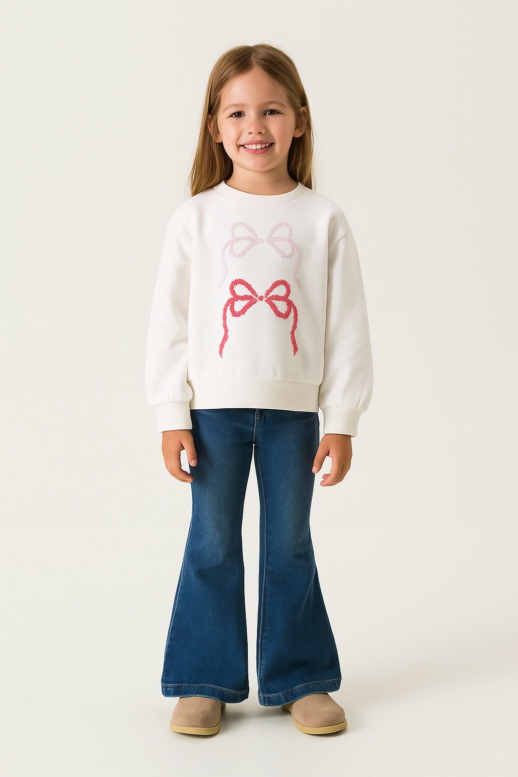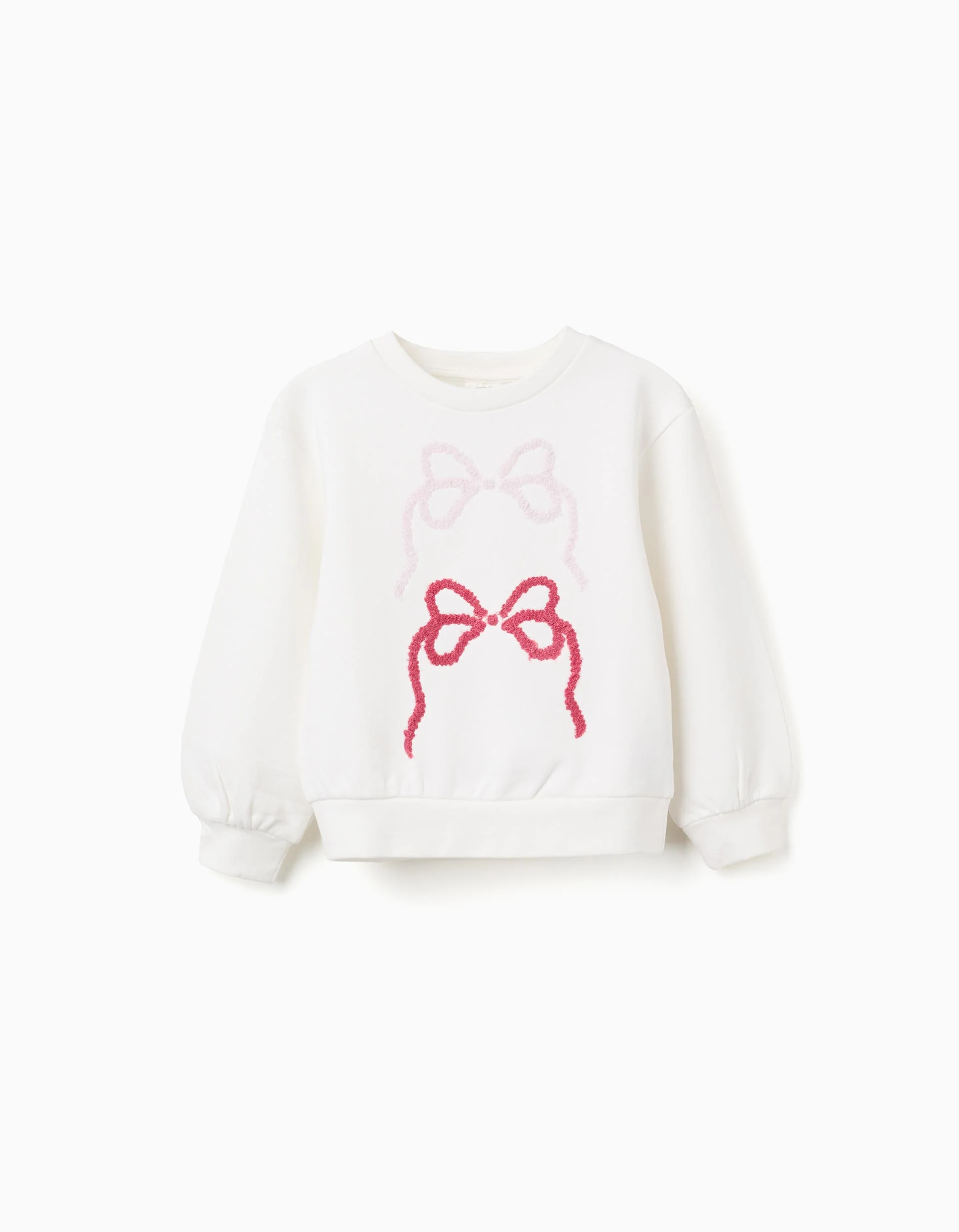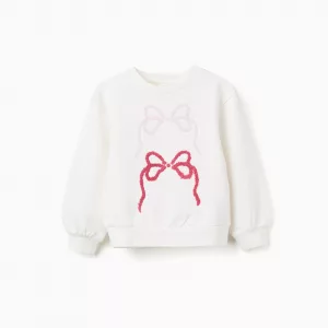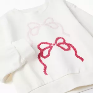 Sudadera blanca para niña, 100% algodón. Con bordado de lazo, uno rosa claro y otro rosa oscuro. Cuello y puños ajustados para un fit perfecto. Mangas ligeramente abullonadas. ¡La pieza perfecta para añadir un toque de estilo a los looks de tu hija!