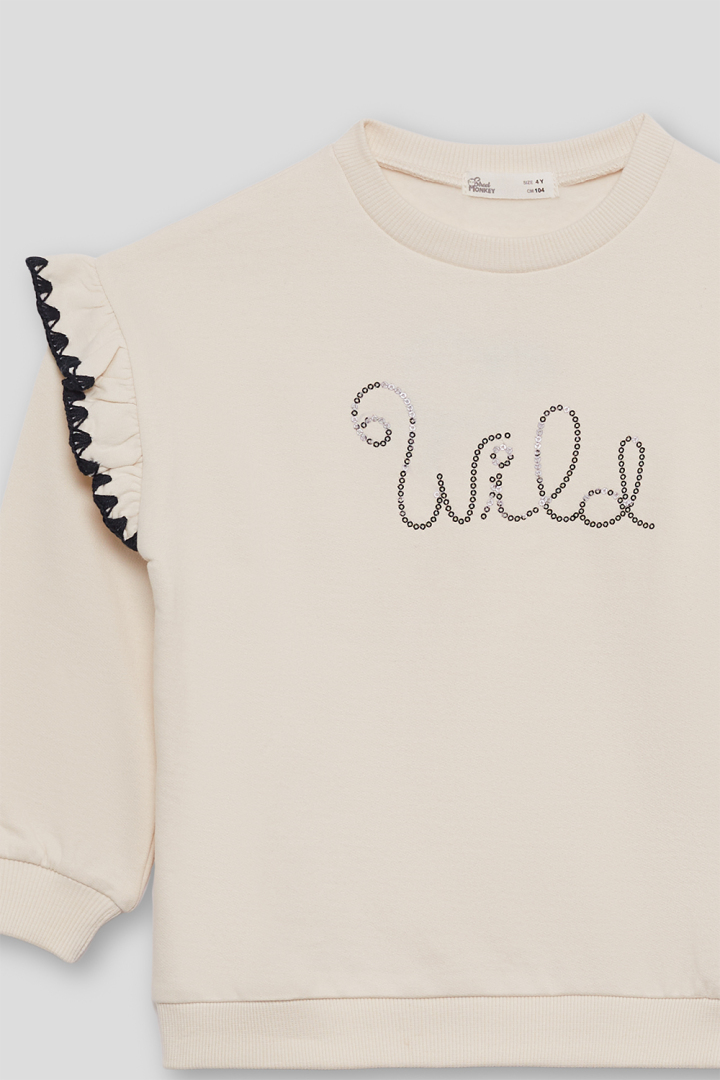 Confeccionada en tejido de felpa suave, esta sudadera en color blanco roto combina comodidad y estilo en una sola prenda. El diseño incluye volantes decorativos en los hombros, cinta de encaje negra y bordado frontal con la palabra “Wild” en lentejuelas negras