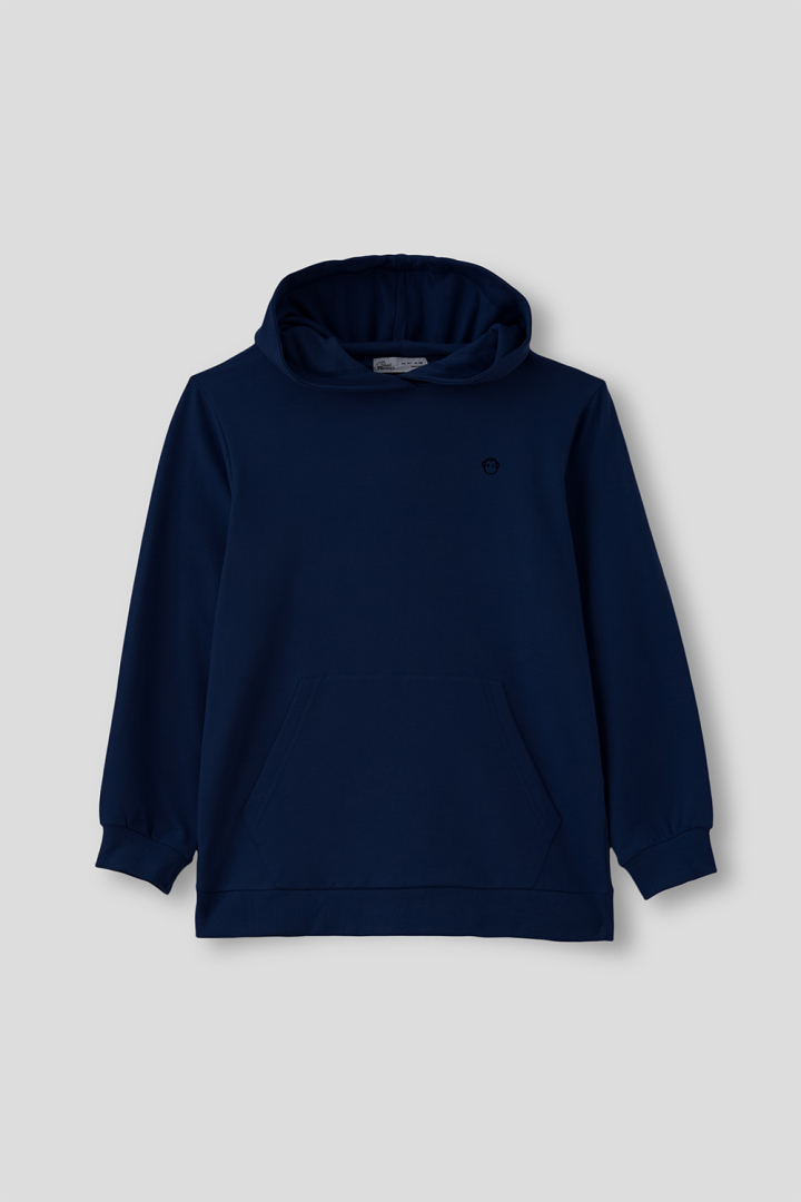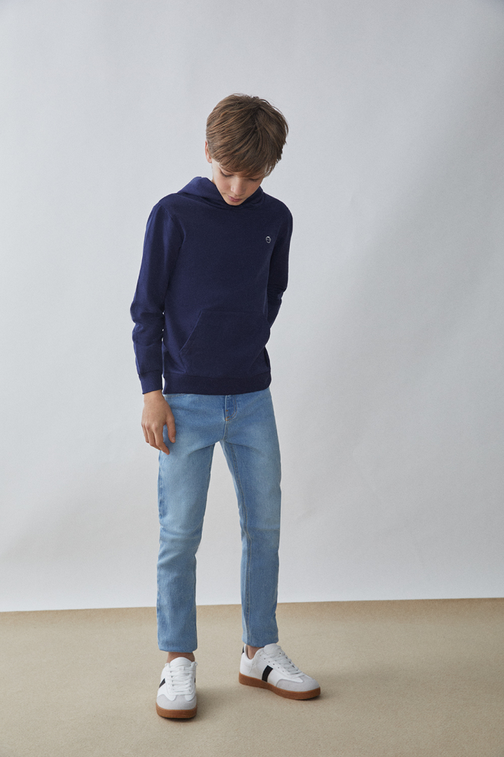 Sudadera con capucha para niño, confeccionada en algodón suave. Incluye gorro ajustable con cordón al tono, bolsillo estilo canguro y logo en el lateral. Puños y bajo elásticos para un ajuste cómodo. Corte regular fit.