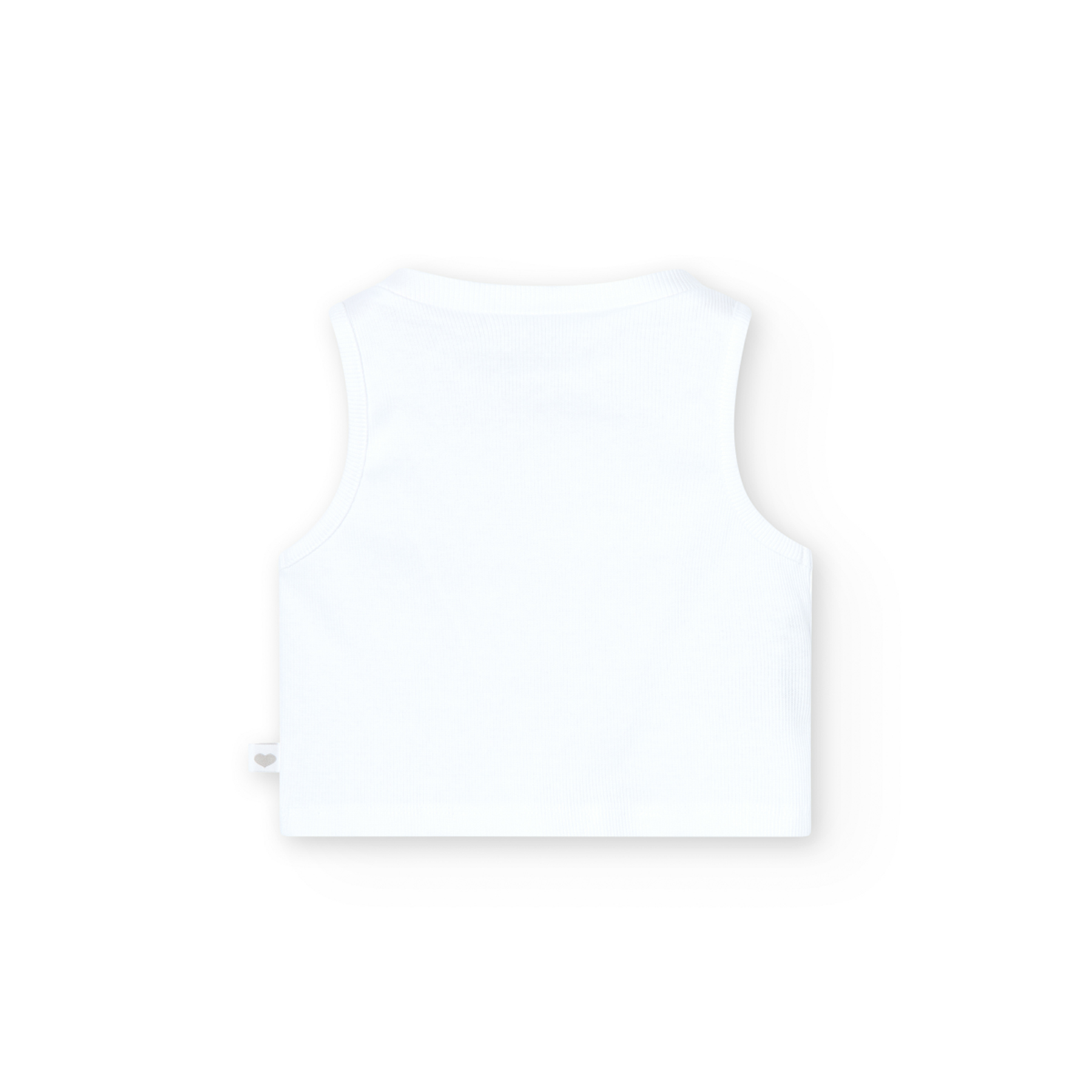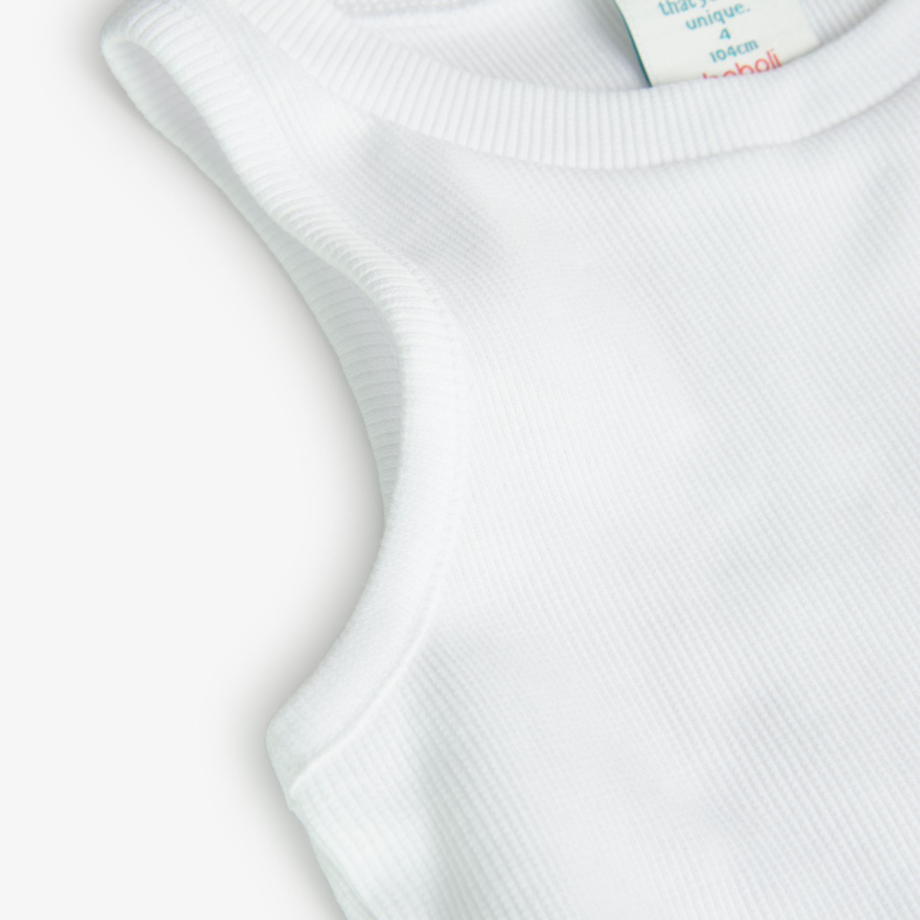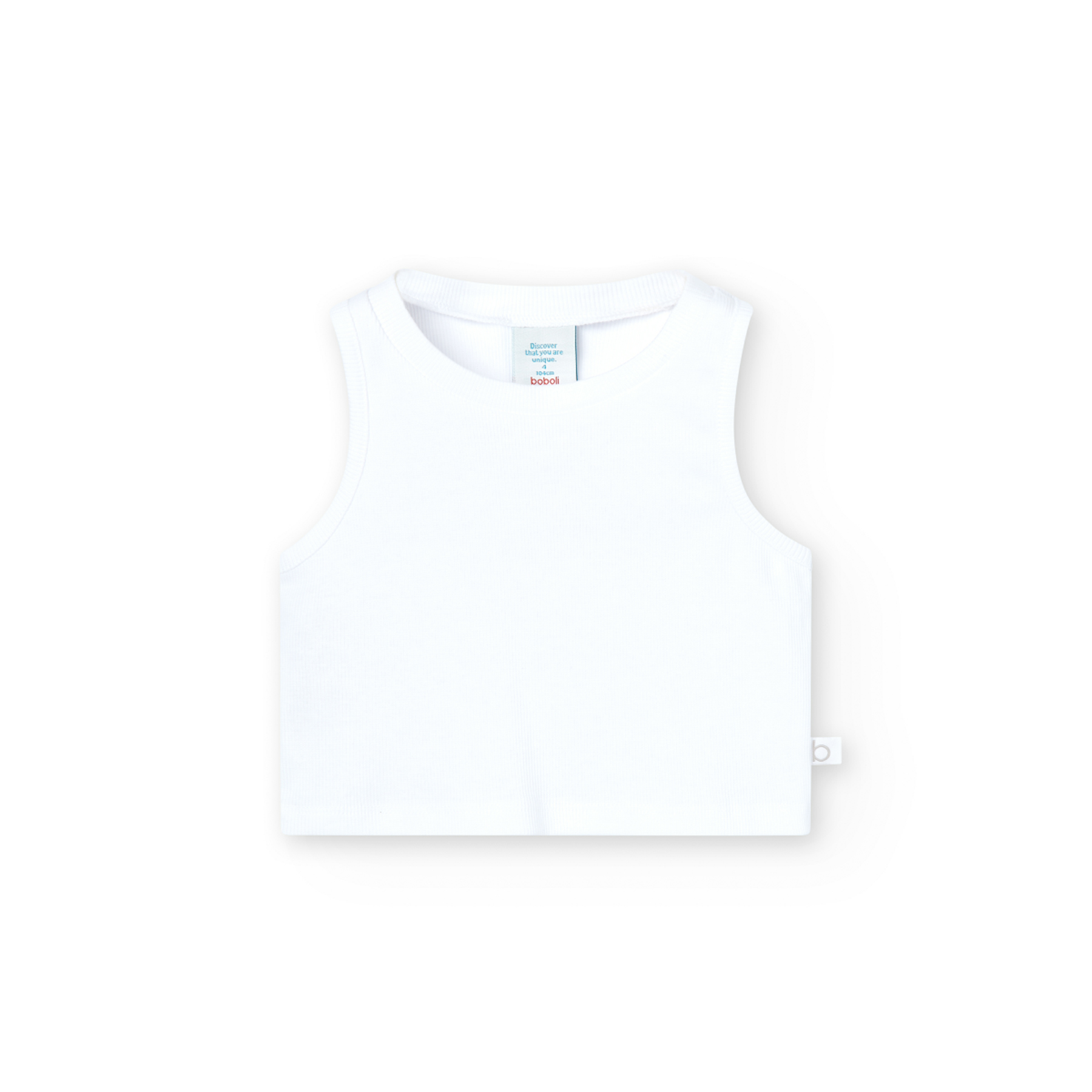 Este top de punto canalé para niña es una prenda esencial para el verano. Con un diseño liso y color blanco, es perfecto para combinar con cualquier prenda. Su cuello redondo y tirantes hacen que sea cómodo y fresco para los días más calurosos. Está disponible en tallas desde los 4 hasta los 16 años. El tejido de punto es suave y resistente, ideal para el uso diario. Este top es una opción versátil y práctica para el armario de cualquier niña.