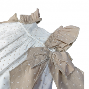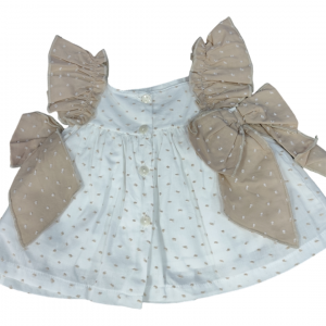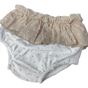 Para un conjunto perfectamente coordinado, este vestido viene acompañado de una braguita a juego en blanco con puntitos marrones, que garantiza comodidad y libertad de movimiento para tu pequeña.