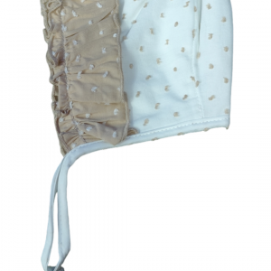 Pero eso no es todo, ¡nuestro conjunto incluye también un adorable gorro con volantes! Confeccionado en blanco y marrón con el mismo estampado de puntitos, este gorro se ata suavemente bajo la barbilla del bebé, asegurando que se mantenga cómodo y calentito en cualquier ocasión.