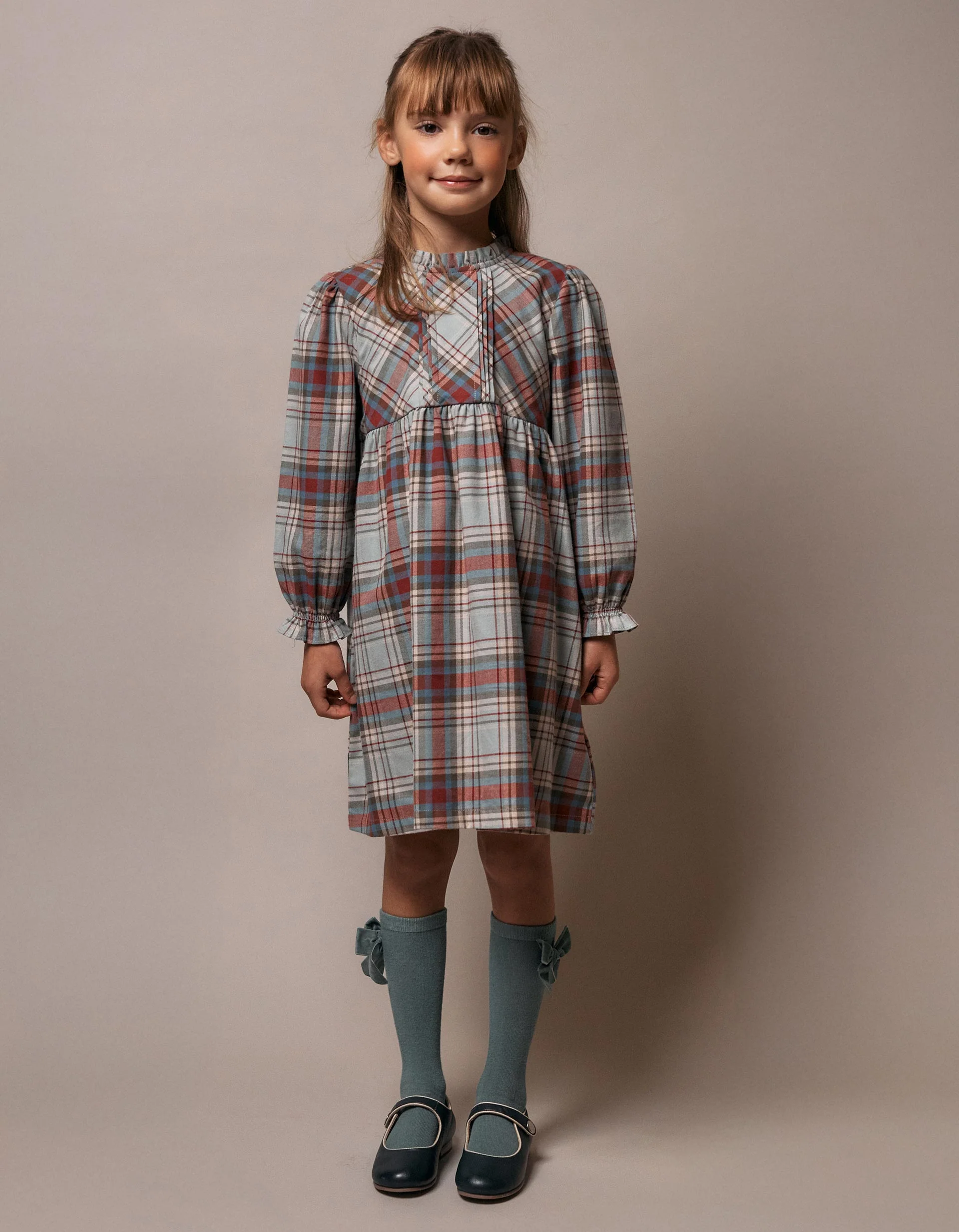 Vestido clásico y elegante para niña, con estampado de cuadros en tonos verde claro y oscuro, azul, beige, rojo y marrón. En algodón suave, asegura que tu niña se sienta cómoda durante todo el día. Ya sea para una fiesta, un paseo o un día en casa, este vestido es versátil y práctico para el uso diario. ¡Para looks elegantes, coordinados entre hermanos y hermanas!