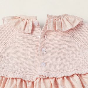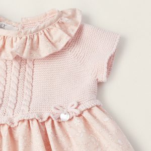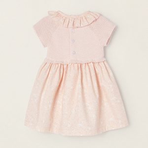 Vestido rosa de dos tejidos para recién nacida, 100% algodón. Parte superior de punto con detalle trenzado y lacito decorativo. Falda y cuello con estampado floral. Volante decorativo en el cuello. Cierre detrás con botones para vestir fácilmente. Un vestido adorable y agradable, esencial para el confort diario de tu bebé