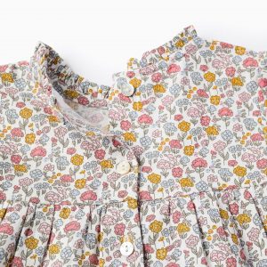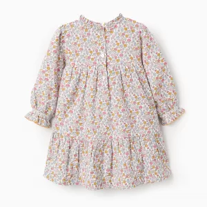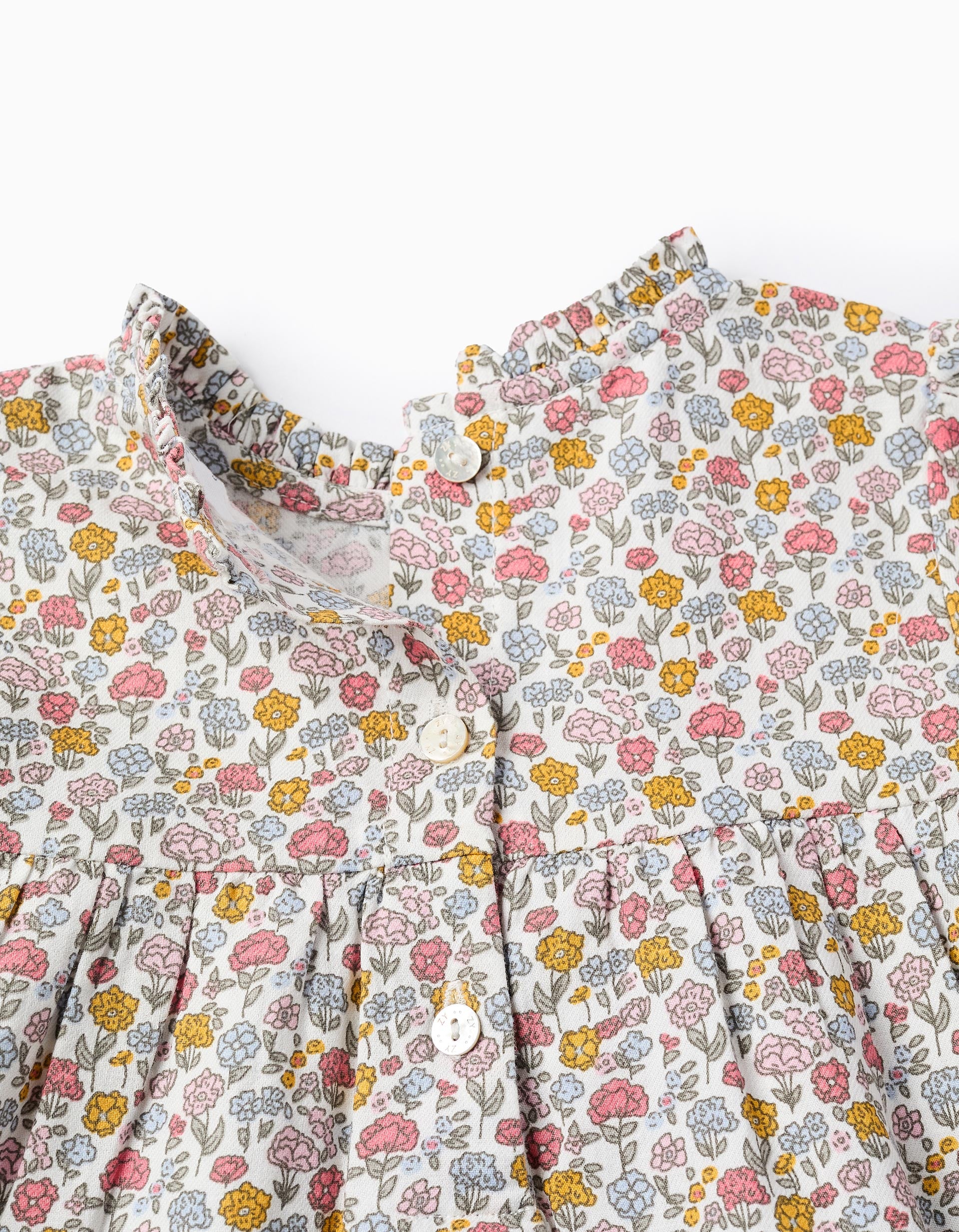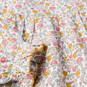 Vestido floral en tonos de amarillo, rosa y azul para bebé niña. Volantes en el cuello y en los puños. Corte evasé. Botones en la espalda para vestir fácilmente. Puños elásticos para un ajuste perfecto. ¡Un motivo floral multicolor con un toque vintage!