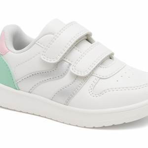Deportiva blanca para niña con cierre de velcro y detalles en rosa, verde y plata, disponible de la talla 24 a la 29. Un modelo cómodo, ligero y fácil de poner, perfecto para el día a día.