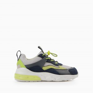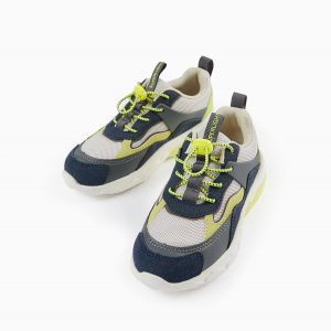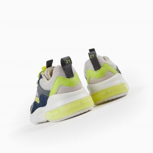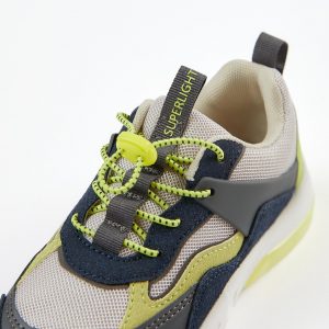 Zapatillas para niño, con parte superior de piel sintética, goma y mesh, de colores beige, gris y verde lima. El ajuste se hace a través de cordones elásticos ajustables, con sistema de cierre único, fácil y sin nudos. Interior de tela. Suela chunky muy ligera y antideslizante, con luces LED que se encienden al caminar. ¡Un par de zapatillas cómodas y divertidas! Big Me: plantillas con semicírculos para que el niño identifique por sí solo el pie correspondiente, desarrollando su autonomía.