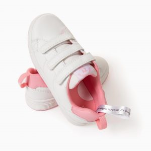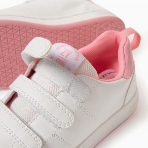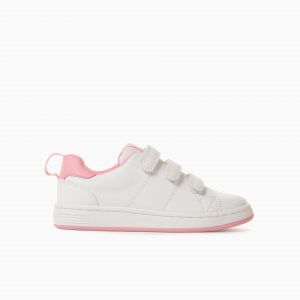 Zapatillas blancas infantiles de piel sintética, con detalles rosa y lengüeta de mesh. Tirador con detalle estampado. Cierre con tiras autoadherentes, para calzar y ajustar con facilidad. Interior de tela. Suela de goma antideslizante. Big Me: plantillas con semicírculos para que el niño identifique por sí solo el pie correspondiente, desarrollando su autonomía.